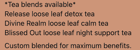 "Divine Realm" loose herbal tea delivers a carefully curated blend designed to promote calmness and relaxation. Contains peppermint, rose petals, chamomile, nettle and calendula. This 1/2 oz. portion of premium loose leaf herbs offers flexibility for multiple infusions, allowing you to customize strength and steep time to your preference. Each cup provides a soothing ritual that supports your wellness routine. Perfect for those seeking a natural approach to stress relief and emotional balance.