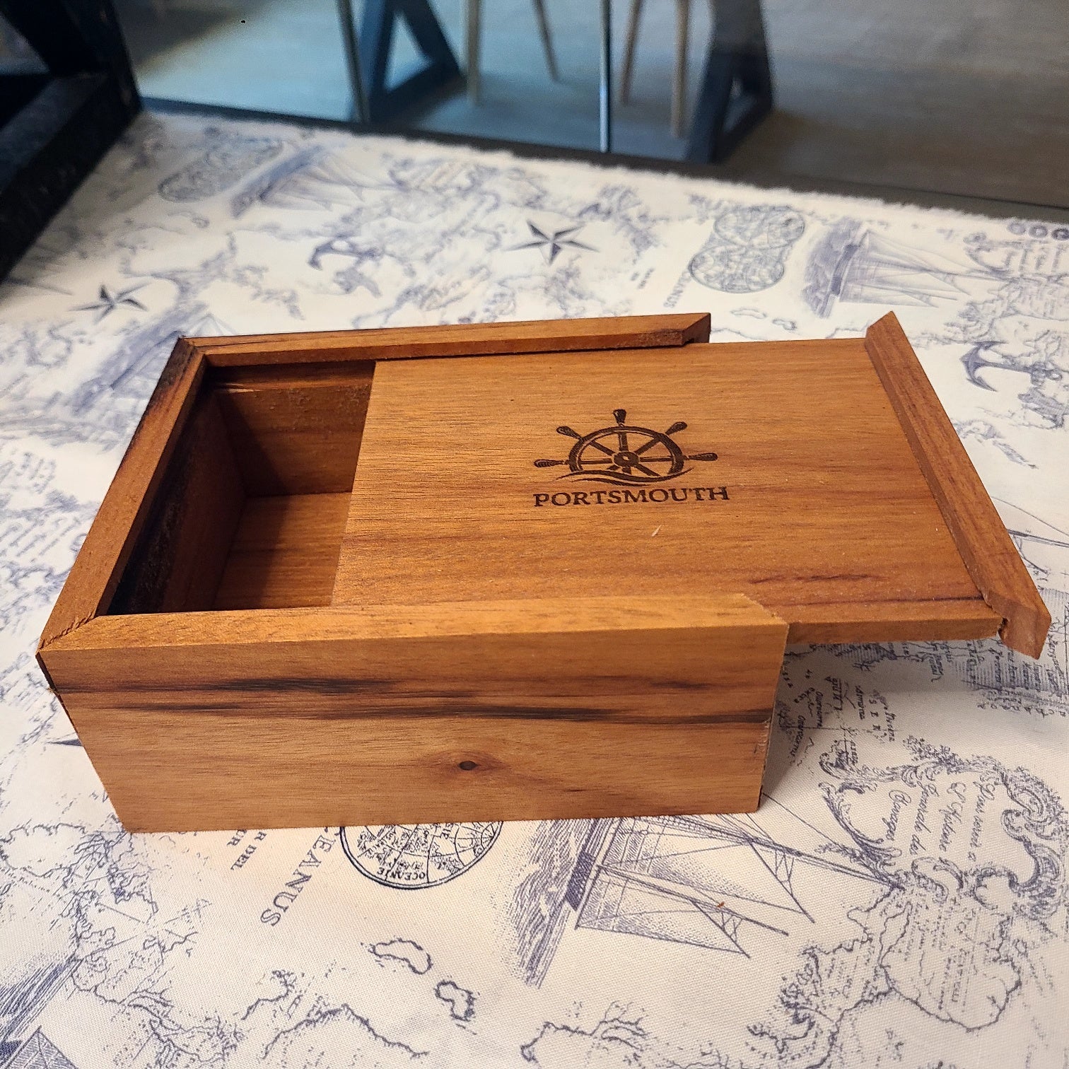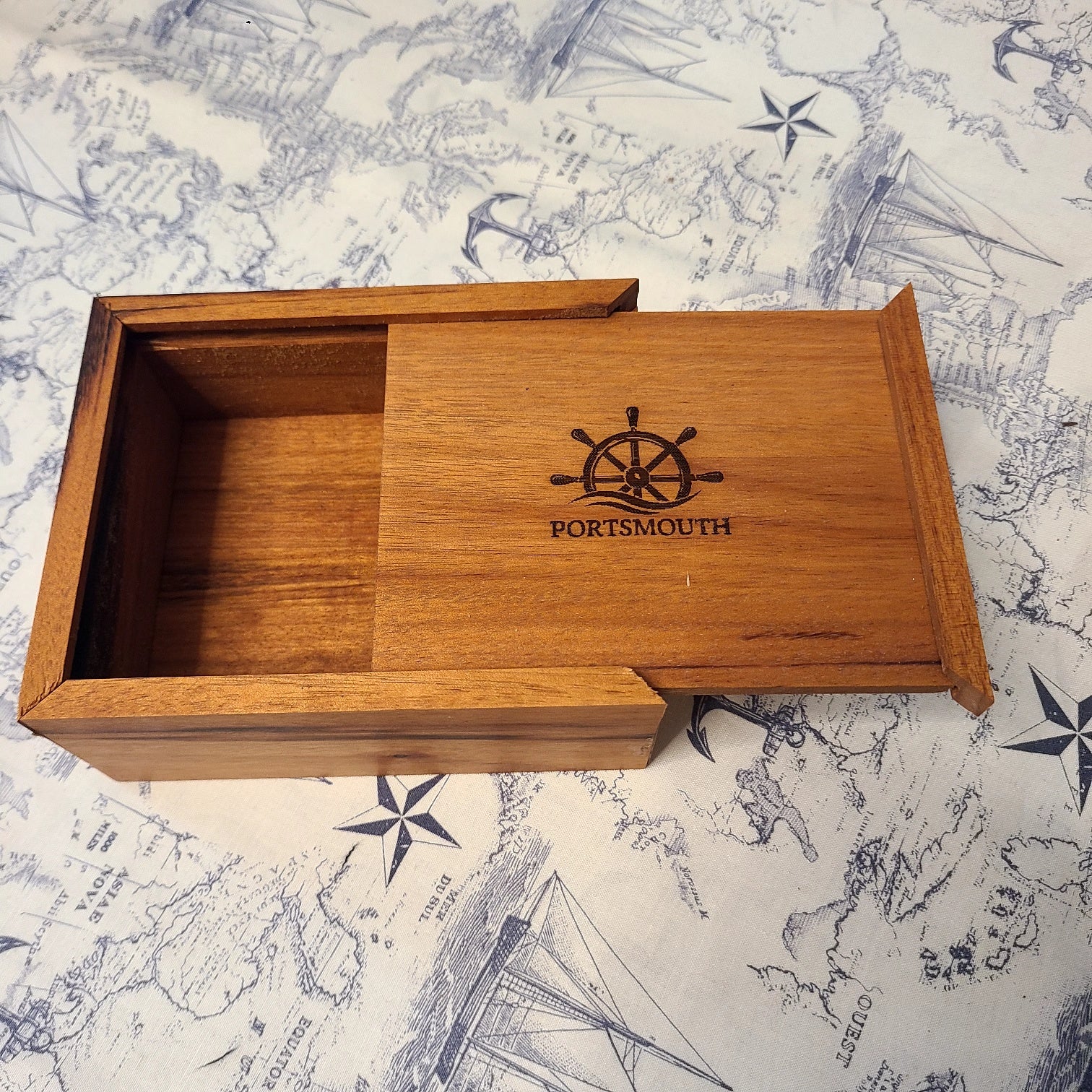 Discover refined storage with this Wood Storage Box by Rick Becksted, featuring a smooth sliding top for easy access. Measuring 6" x 4 1/4", it is adorned with a detailed Portsmouth and Ship’s Wheel design, blending functional elegance with maritime-inspired artistry. Perfect for organizing cherished items, this box adds a sophisticated touch to any space.
