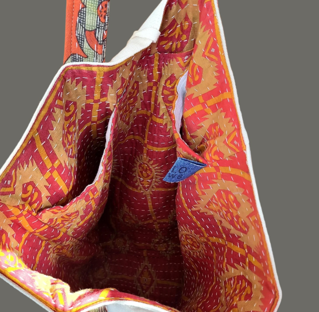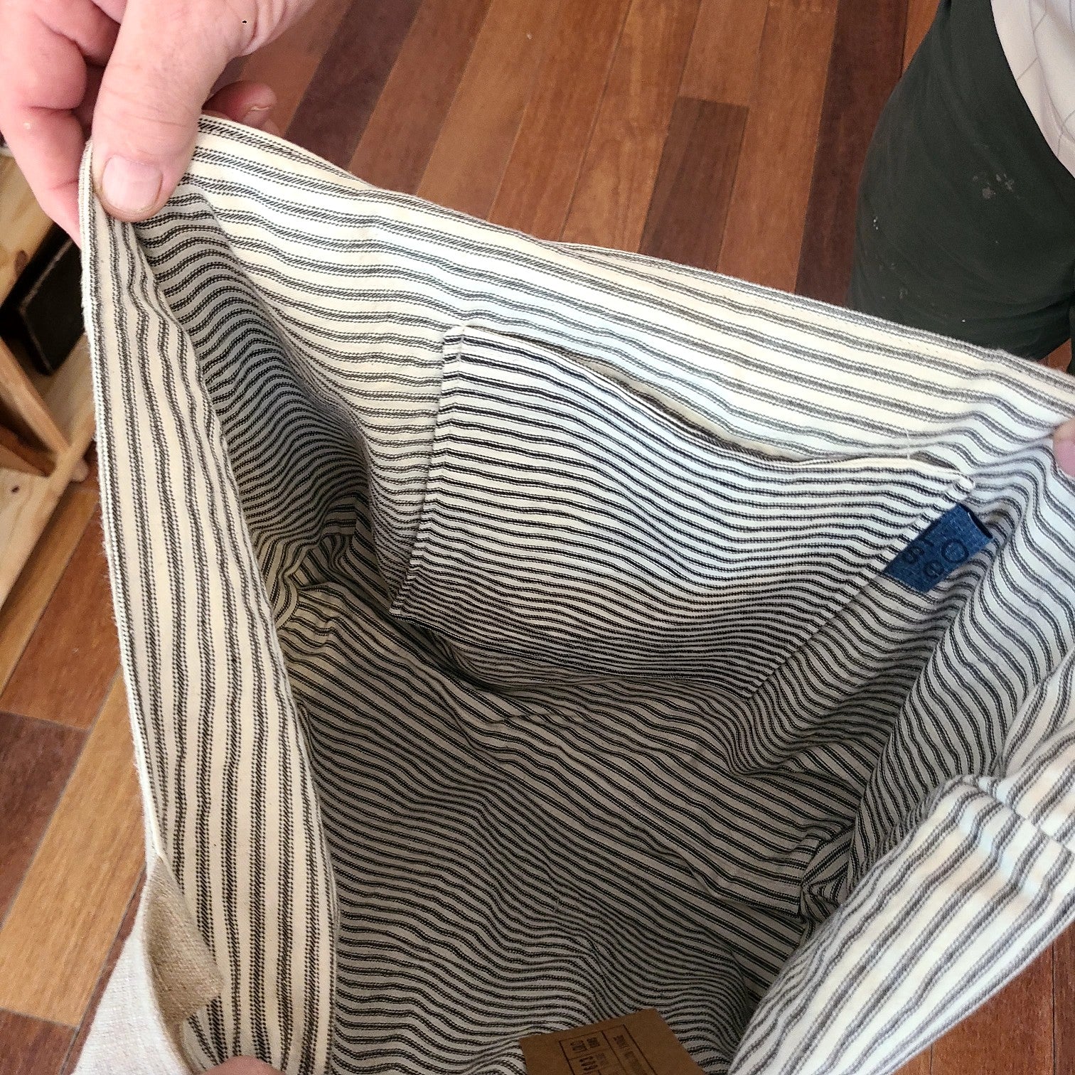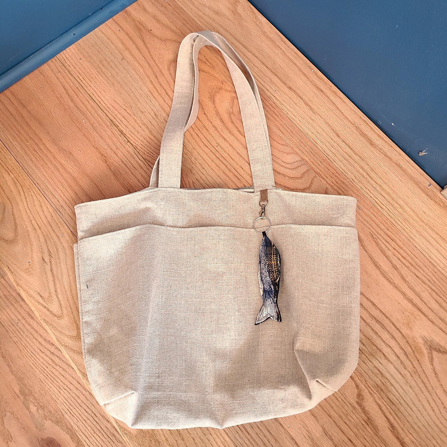 Ecru Linen medium sized bag with blue stripe lining with fabric fish (Hillside Studio) OL