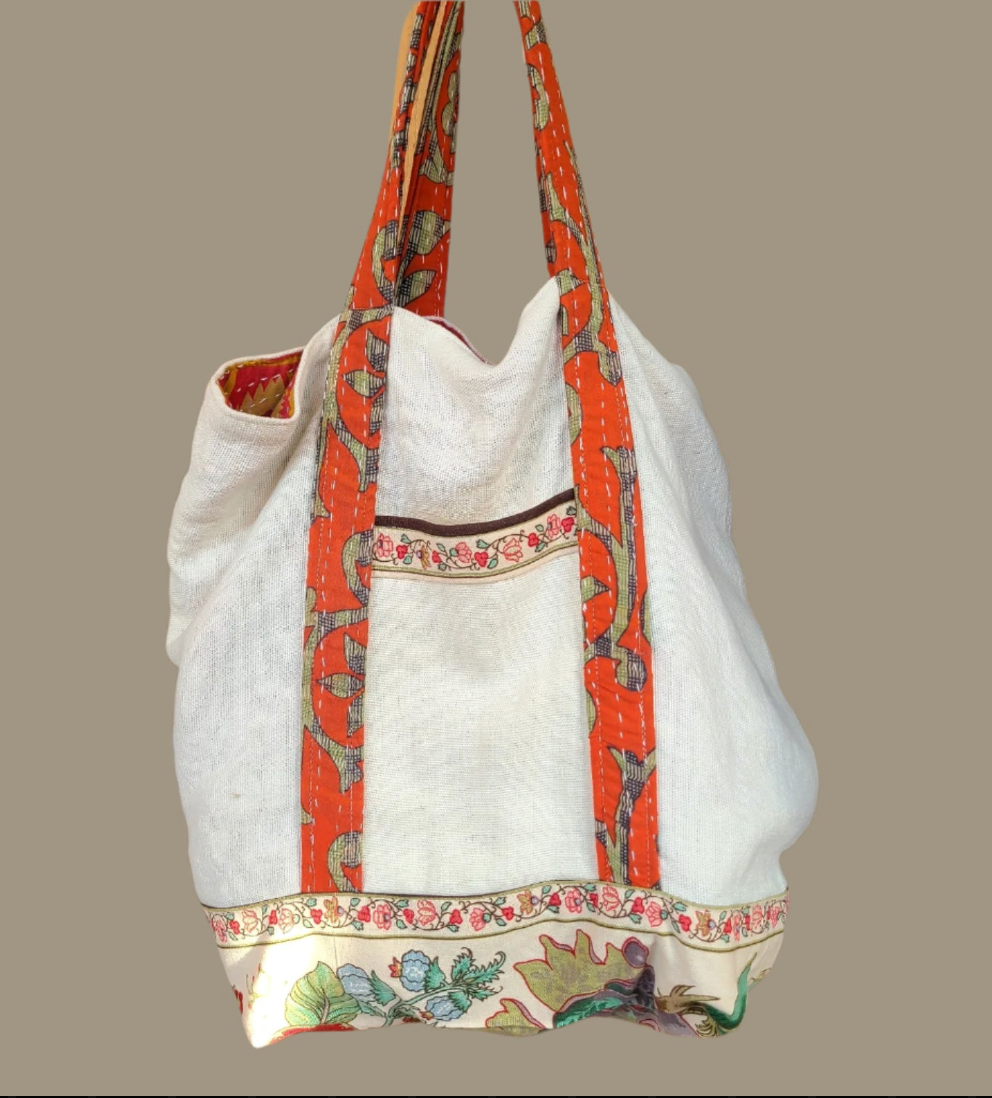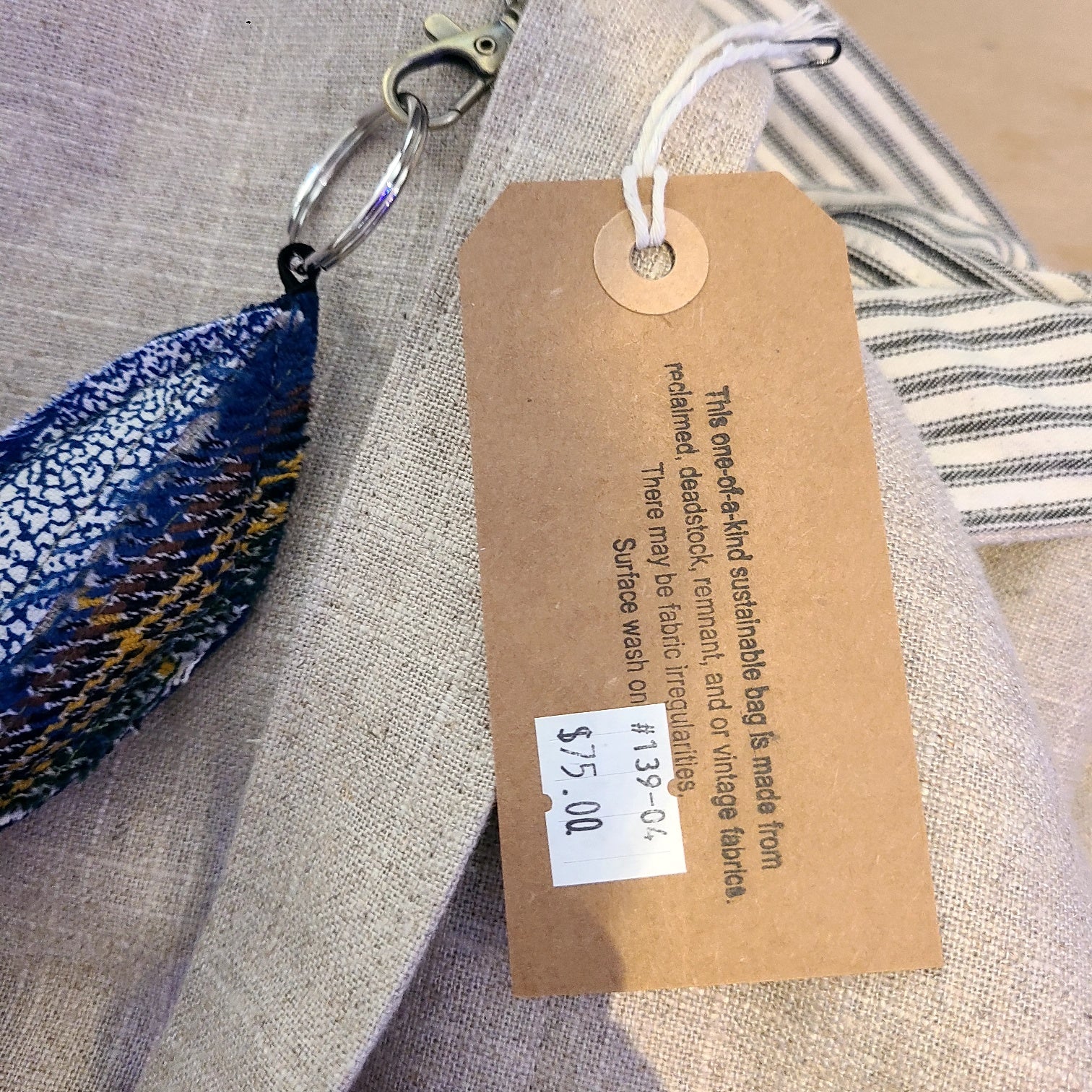 Exquisitely handcrafted medium sized linen satchel by our NH Made textile artisan, Hillside Studio in Cornish, NH. Ecru color with blue/white stripe lining. A whimsical cloth fish is attached! Each design is one of a kind made from vintage and collected fabric remnants. Each piece is infused with story, character, and a sense of found object-eclectic, mysterious, and unique.