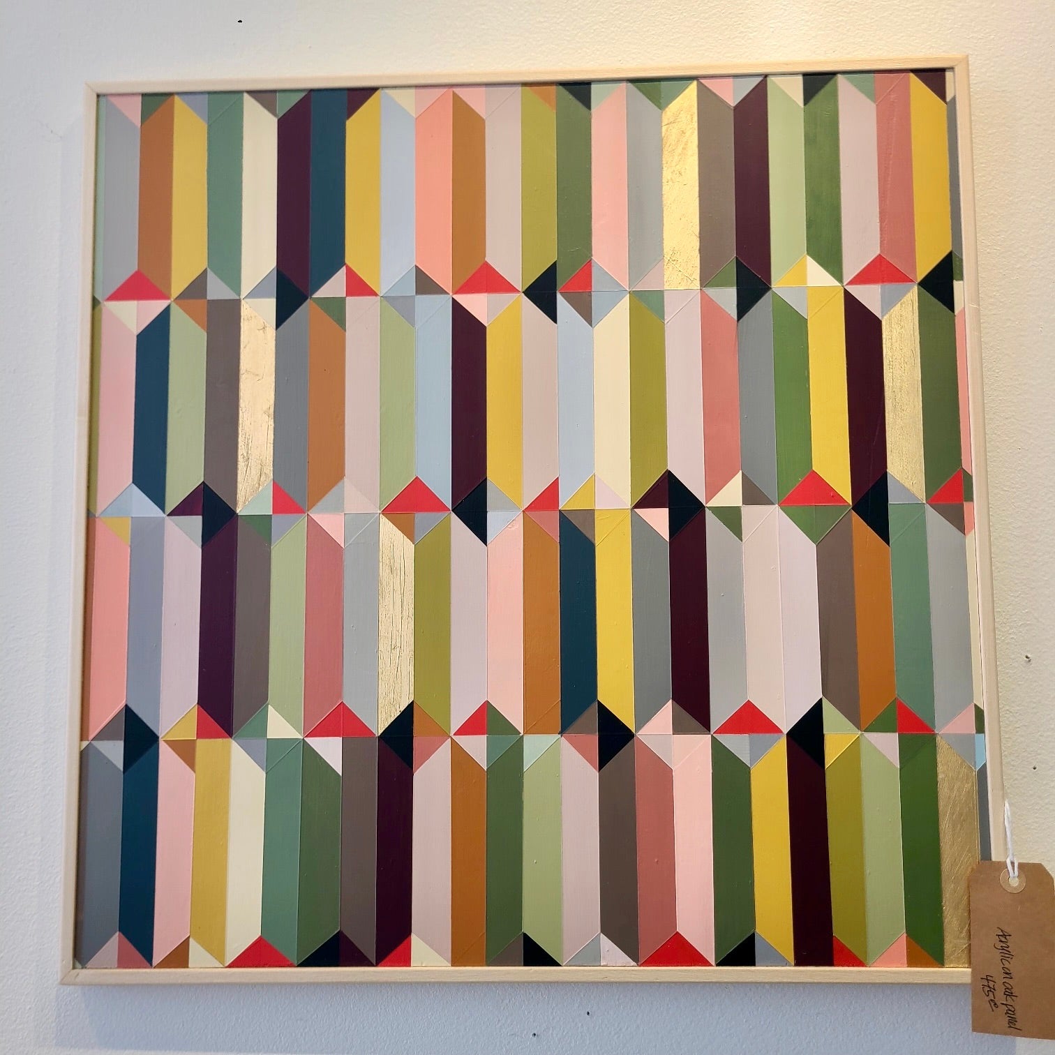 Stunning colors & placement adorn this oak panel acrylic painting from NH Made's Hillside Studio, Cornish, NH. This particular piece is a modern interpretation of traditional quilt motifs, painted on oak panels and sealed with multiple coats of polyurethane for durability-indoors or out.