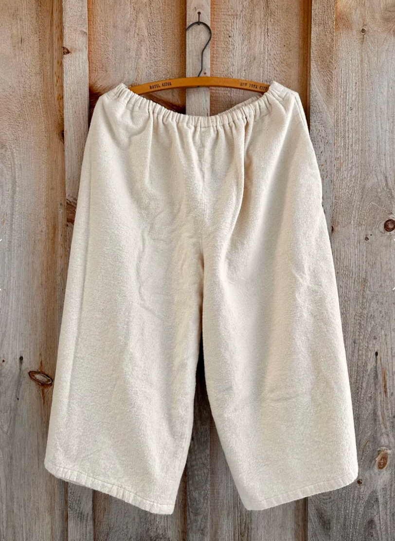 Cropped wide legged pants. Elastic and drawstring waist.