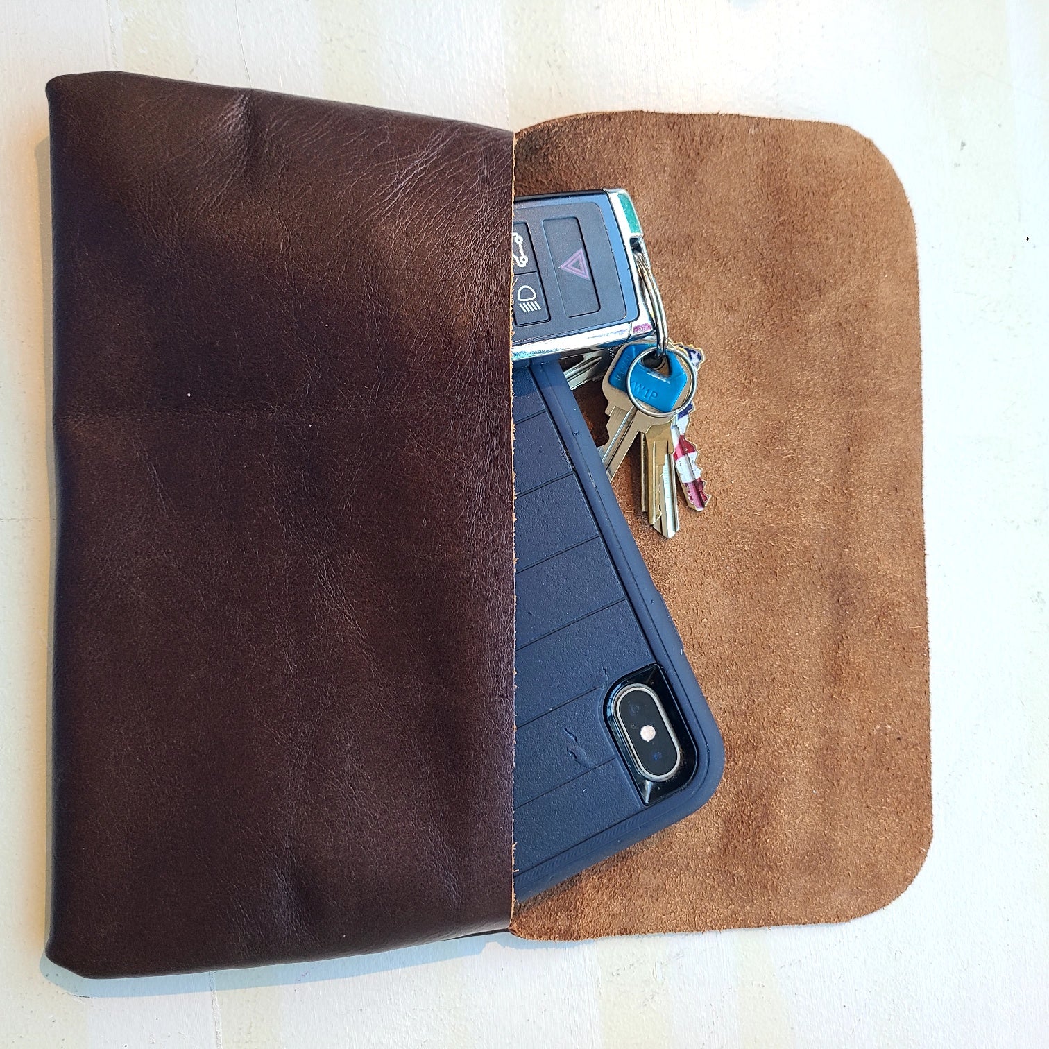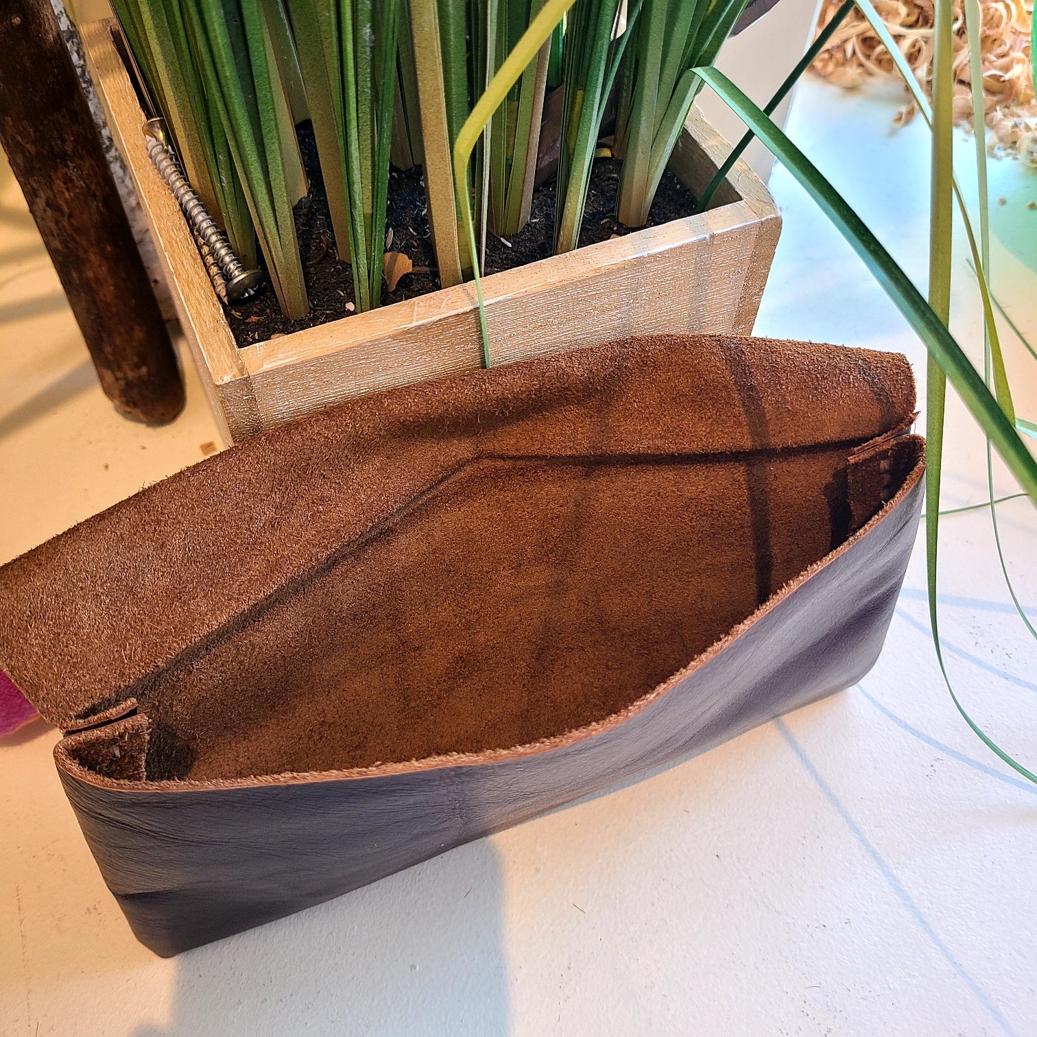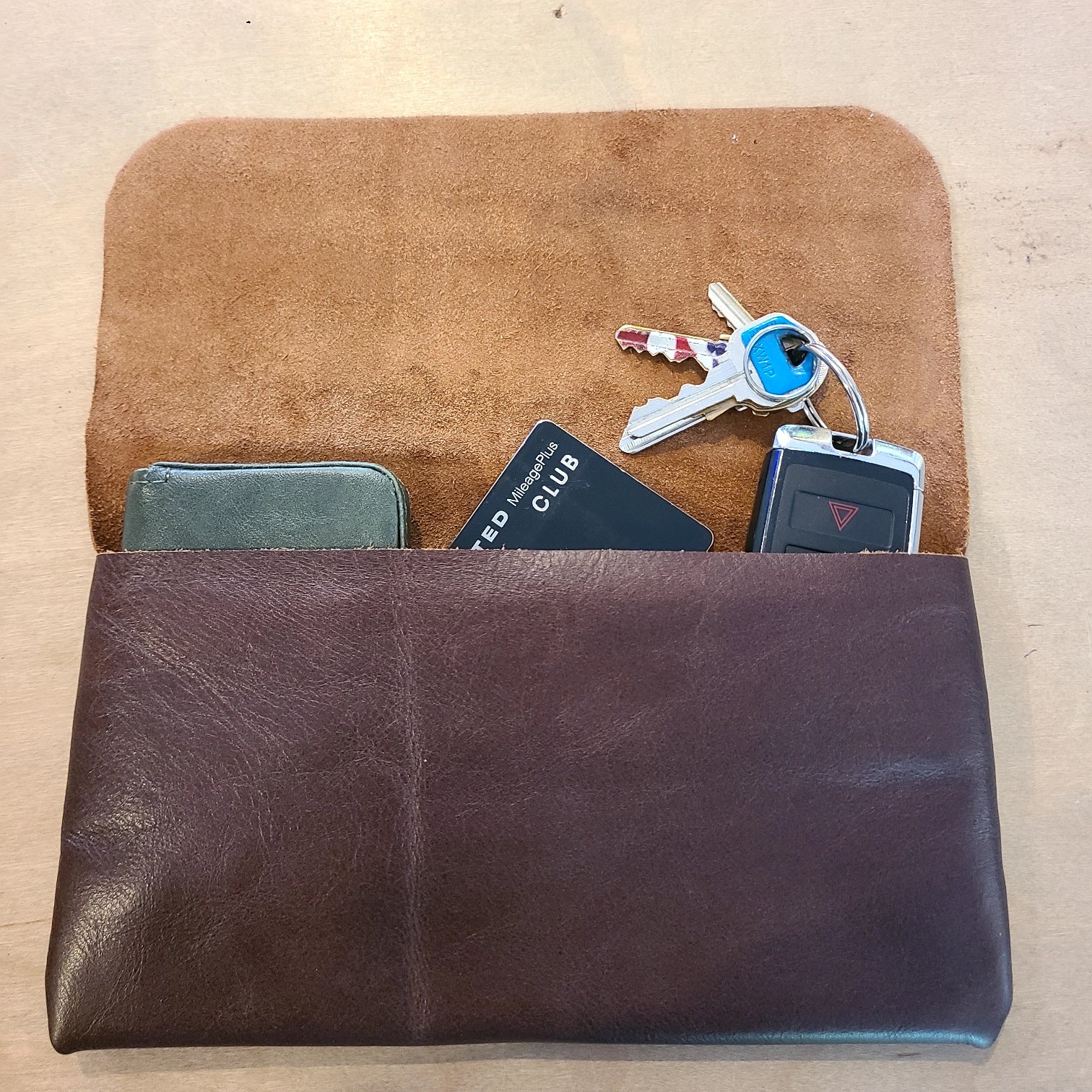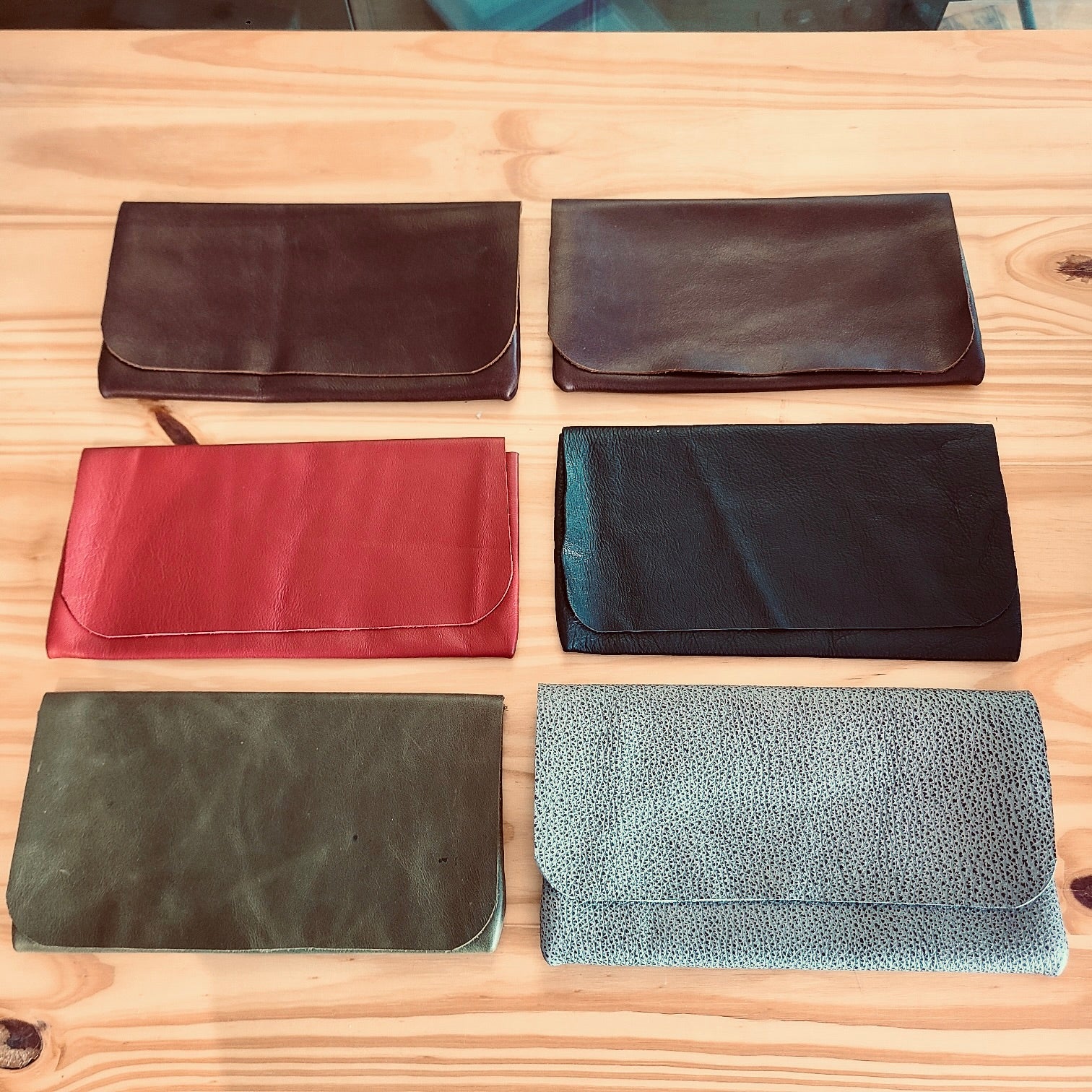 This sophisticated leather clutch from DOC's Designs is crafted using repurposed organic materials, combining eco-friendly practices with artisan quality. Its sleek design and careful craftsmanship make it an elegant accessory for everyday use, offering both style and sustainability in one refined piece. Dimensions 8 3/4 x 4 3/4. 1 available in each color.