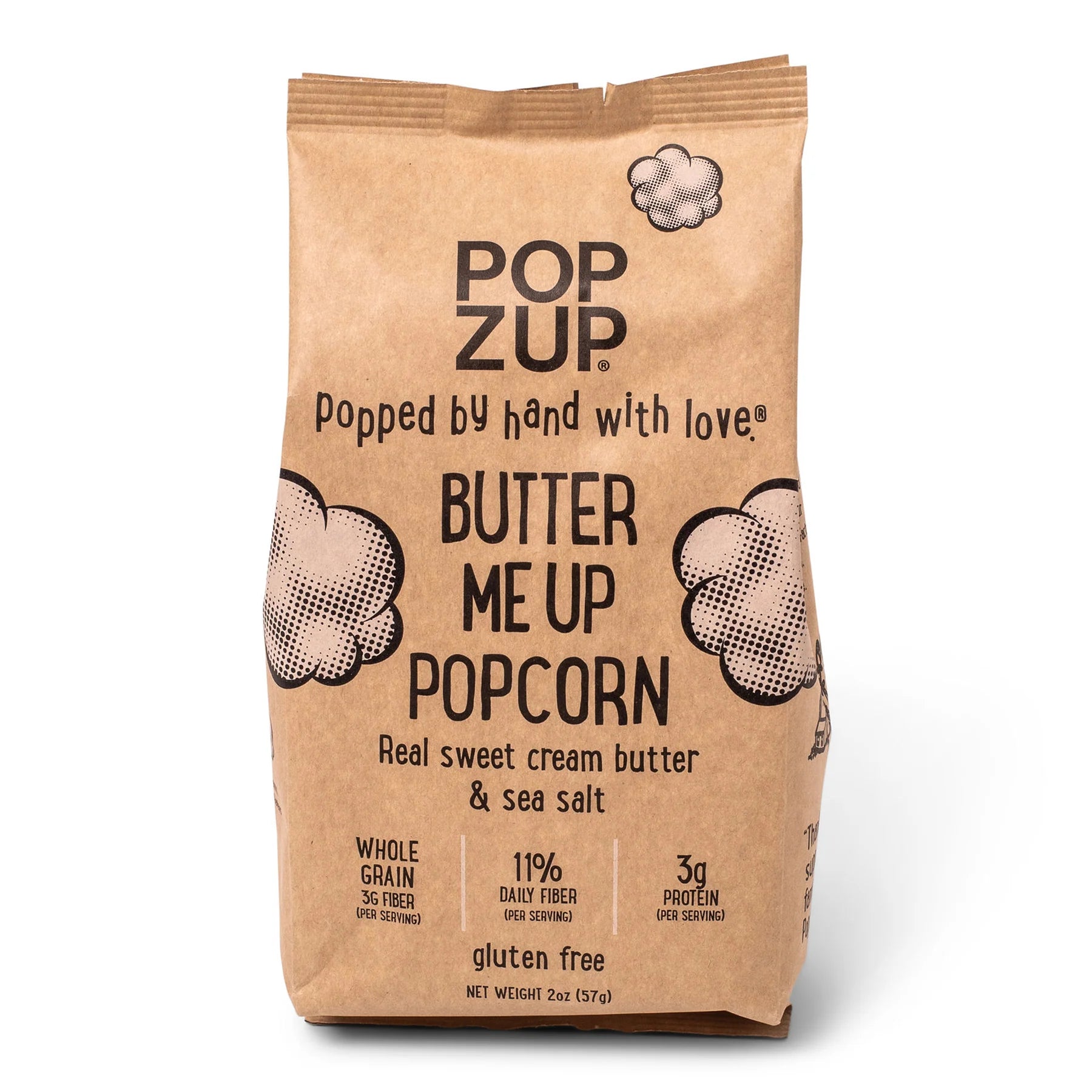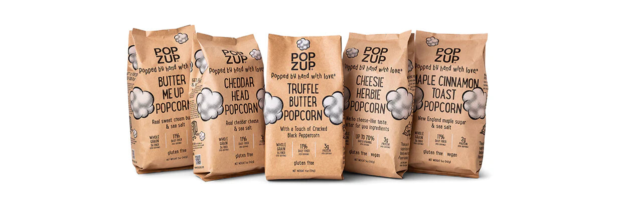 Get your taste buds popping with Popzup's small batch, simple ingredient popcorn! Each bag is filled with single-sourced ingredients, like the rich and buttery Butter Me Up, the savory and cheesy Cheesie Herbie, the sweet and decadent Maple, the bold and flavorful Cheddar and the pure sweet cream butter infused with real black truffles, fresh cracked black peppercorn, turmeric, and sea salt of Truffle Butter. Say goodbye to boring popcorn and hello to Popzup!